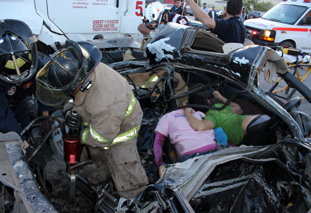 19/12/2015 - Dos obreros, un hombre y una mujer, perdieron la vida prensados en el automóvil que iban, y otra dama se debate entre la vida y la muerte al estrellarse contra dos tráileres en el kil