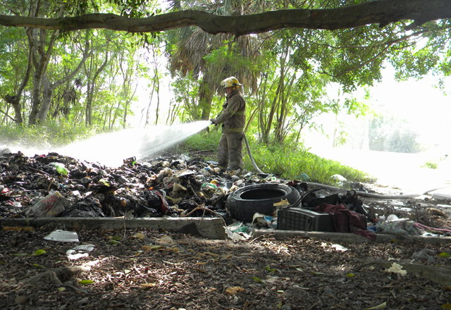 7/12/2015 - Manos criminales movilizaron a elementos del Heroico Cuerpo de Bomberos, al prenderle fuego a un basurero clandestino, ubicado por la carretera Lauro Villar Ochoa, a un costado del fracci
