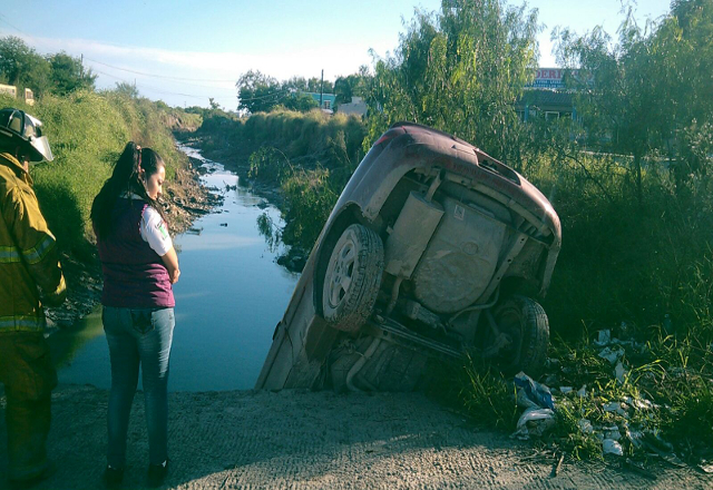 4/12/15.- Una mujer que radica en la colonia Granjas de la Reforma, ayer por la tarde se llevó el susto de su vida luego de que cayera con todo y auto al canal que pasa a unas cuadras de su casa, por