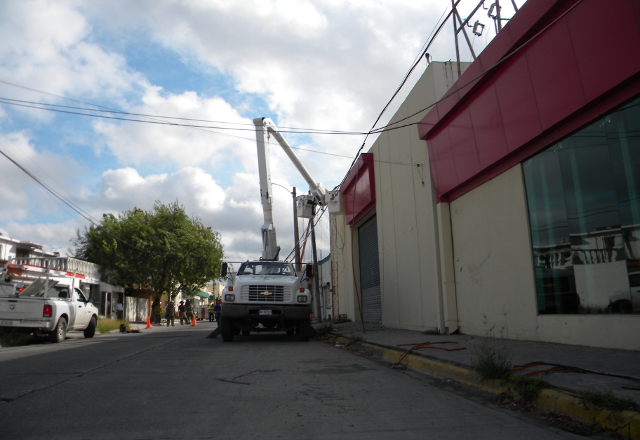 18/11/15.- Los fuertes vientos predominantes durante la mañana de ayer, derribaron una antena que estaba en la azotea de una agencia automotriz de las calles Sexta y Camilo Manzo, la cual cayó al pi