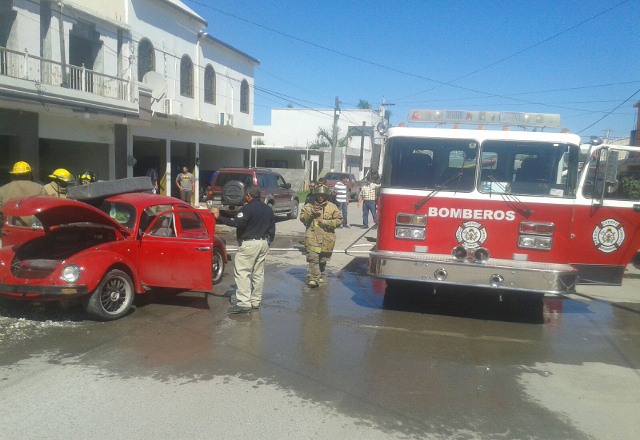 3/11/15.- Cuando apenas iba a calar el auto que desde hace tiempo estuvo remodelando, pues es un Volkswagen Sedan clásico, éste ardió en llamas, por lo que los mismos vecinos de la colonia Mariano