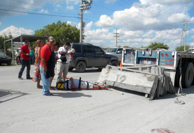 17/10/2015 - Un particular que tiene su domicilio en la colonia República Norte, resultó con diversas heridas en el cuerpo, al caerle las redilas de la caja de un tráiler en la avenida Constituyen