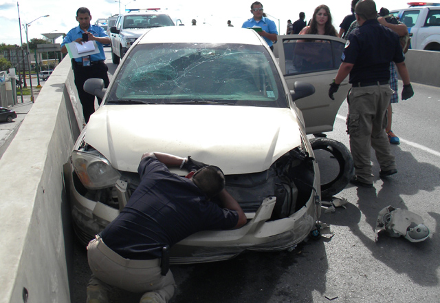 13/10/2015 - Lesionada al estrellarse contra el muro de contención y con un poste de fierro de alumbrado público, que quedó derribado y obstaculizando la circulación vehicular en la joroba del pu