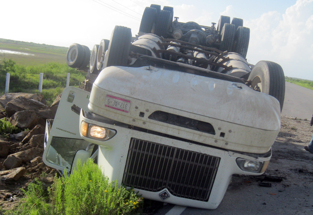 17/09/2015 - El chofer de un tráiler con doble remolque, resultó con graves heridas en el cuerpo, al volcarse con la pesada unidad que iba cargada con enormes piedras, en el kilómetro 36 de la car