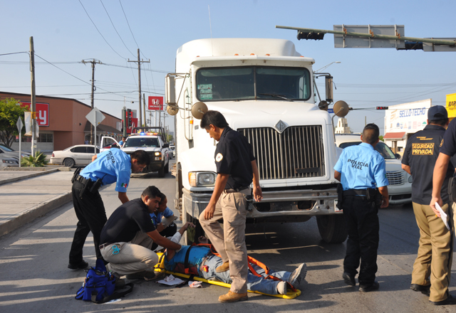 06/09/2015.- Un ciclista resultó con graves lesiones en horas de la mañana sobre el cruce de las avenidas Pedro Cárdenas Gutiérrez y Longoria, al ser chocado por un tráiler cargado con unos monta