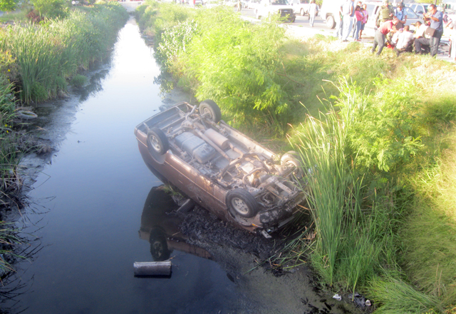 10/08/2015 - Bien hediondos quedaron padre e hijo, en su camioneta minivan, al volcarse en el canal de aguas negras, paralelo al boulevard Manuel Cavazos Lerma y calle 22, frente a la colonia Obrera,