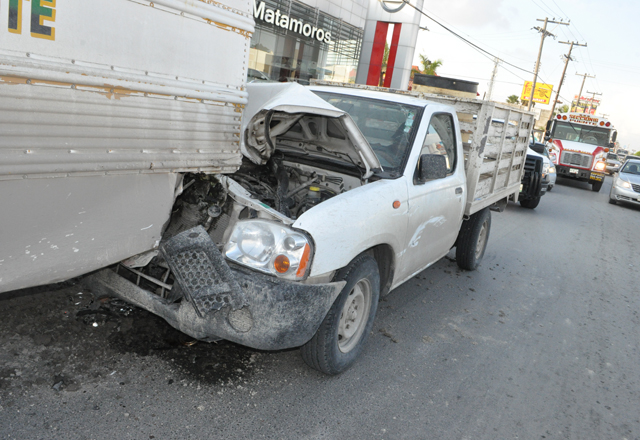 20/03/15.- Debido a una distracción fue que el conductor de una camioneta Nissan Estaquitas terminó estampándose contra un camión de transporte público, dejando su camioneta considerablemente da