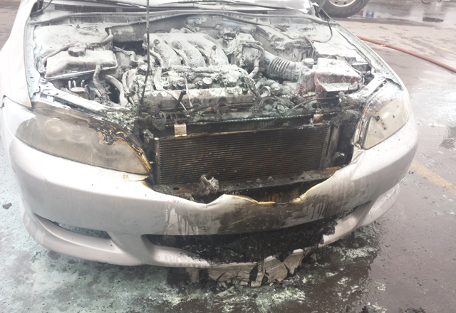 17/03/15.- Presuntamente a consecuencia de un cortocircuito en el cableado fue que un coche estacionado en un centro comercial se incendió de la parte del motor, causando una movilización de unidade