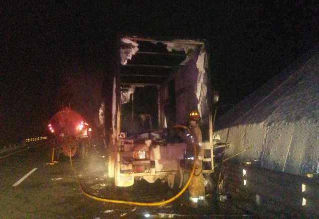 03/02/2018-Presuntamente a consecuencia de un cortocircuito en las baterías, fue que se prendió en llamas un camión de carga en el kilómetro 26 de la autopista a Reynosa, hechos que provocaron la