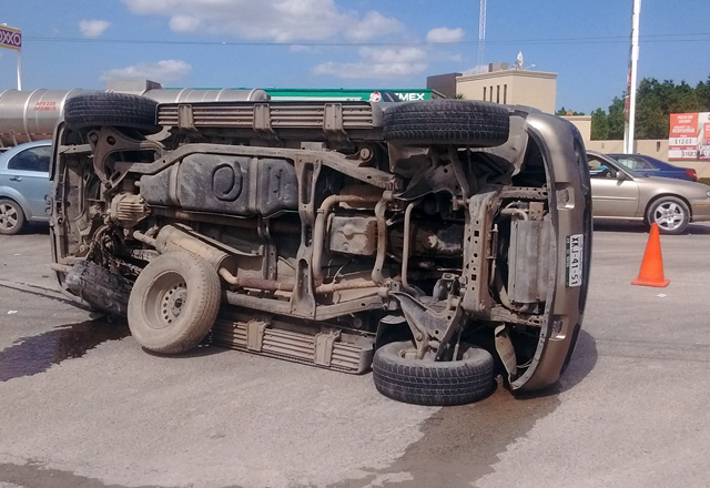 15/03/2017 - Un cafre del volante no identificado chocó el automóvil de la hermana de su novia con una camioneta que se volcó en las avenidas Lauro Villar y Diego Rivera, frente al fraccionamiento
