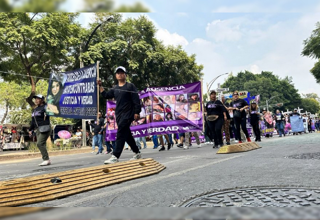 Al grito de "ni una asesinada más" las manifestantes convocadas por la organización Voces de la Ausencia exigen justicia por los casos de mujeres víctimas de la violencia Decenas de mujeres convoca