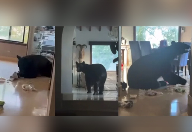 El ejemplar decidió sorprender a la familia, pues éste merodeaba en la cocina del domicilio, en donde fue captado comiendo en el piso. Un oso negro decidió sorprender a una familia al ingresar a la