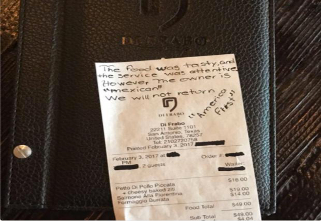 6/02/17.- Los clientes en un restaurante italiano cerca de uno de los barrios más ricos de San Antonio supuestamente dejaron un mensaje racista por el dueño de un restaurante prometiendo no volver p