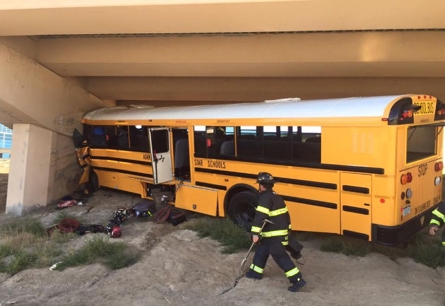 12/09/16.-Un autobús escolar se estrelló contra un pilar de concreto en el Aeropuerto Internacional de Denver este domingo a las 4 de la tarde. El bus era de la Secundaria Three Legacy y en su inter