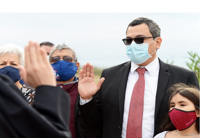 Desafiando el clima frío del viernes, asistentes con cubrebocas presenciaron la ceremonia de juramento del recién elegido Sheriff del Condado de Cameron, Eric Garza, y los más de 120 agentes que tr