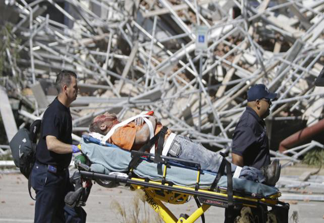 17/10/15.- Varios trabajadores quedaron atrapados bajo los escombros al colapsarse la mañana del viernes un andamio sobre el que laboraban en un edificio en construcción en el centro de Houston, Tex