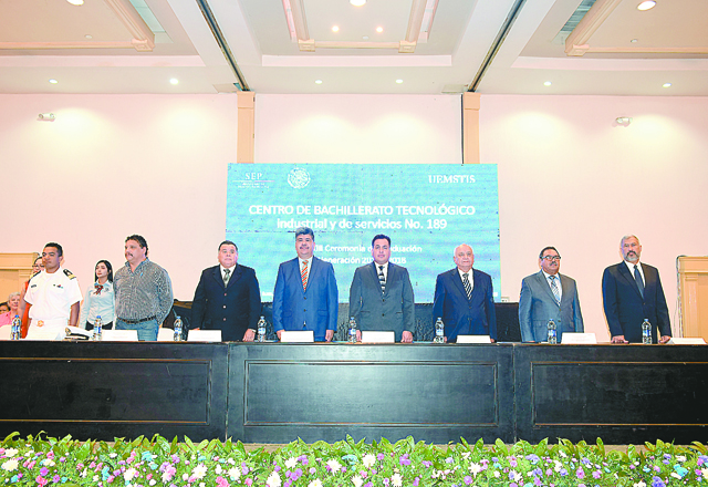 7/07/2018 - Consolidando el prestigio logrado a través de más de treinta años de servicio, el Centro de Bachillerato Tecnológico, Industrial y de Servicios No. 189 de nuestra ciudad llevó a cabo su ceremonia de graduación con la cual fortalece a nuestro país con más de 800 alumnos listos para continuar con su educación superior, dada la magnitud del evento el presidium estuvo integrado por grandes personalidades como: Profr. y Lic. Juan Guerrero Sauceda, en representación del presidente municipal, Jesús de la Garza Díaz del Guante; C.P. Samuel Alcántar Varela, Director del CBTIS 135 y representante de las Oficinas Auxiliares de la UEMSTIS en Tamaulipas; Profr. José Cristóbal Juárez Martínez, en representación de la titular del CREDE, Dra. María Elena Flores Montalvo; Ing. Clemente Cuéllar Palomino Director del CBTIS 275; Ing. Héctor Ramón Ramírez Sampayo, Vicepresidente del Comité de Vinculación con el Sector Productivo; en representación del Comandante del Sector Naval Militar Contraalmirante de Infantería de Marina Diplomado Estado Mayor Federico Alberto Magaña Ramos, el Capitán de Corbeta del Servicio de Ingeniería de la Armada Electrónica Naval, Héctor Miguel García Salas; representando al Secretario General del SJOIIM, Juan Villafuerte Morales, el Coordinador de la Comisión de Educación, Sr. Sergio Villarreal, y engalanando la ceremonia el Ing. Hernando Azael Ramírez Delgado, Director del CBTIS No. 189 y anfitrión del evento, quien fue recibido con una calurosa y nutrida lluvia de aplausos al tomar el estrado y dirigir un breve pero cálido mensaje a los graduados, después de saludar a los integrantes de la mesa de honor, dijo a los alumnos de la Generación 2015-2018 estar muy alegre por el éxito alcanzado durante los tres años de enseñanza que nunca volverán y nunca se borrarán de su memoria, tres años en los que fueron adquiriendo las herramientas y los instrumentos para seguir desentrañando los misterios que preocupan al ser humano, para investigar y dominar lo que la naturaleza esconde, para poner a la luz lo que hasta entonces ignorábamos. Durante estos tres años han tenido ocasión de seleccionar la carrera que desean, porque siempre hay algo más, siempre habrá algo más, no descansen en su deseo de seguir creciendo como personas, como profesionistas, no digan nunca “yo lo sé”, digan siempre “me interesa seguir sabiendo más”, concluyó.