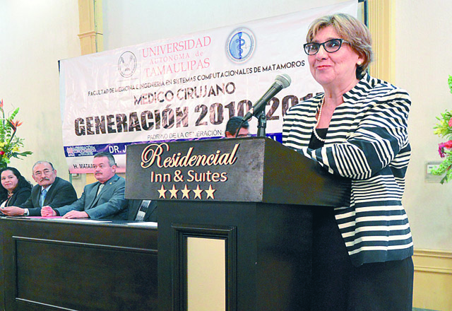 El evento fue encabezado por el honorable presidium que estuvo integrado por el MSP. Pedro Luis Mendoza Múzquiz, Director de la facultad; Dr. Rubén Montalvo Montelongo, Decano y Secretario Académico; Dra. Marina Magdalena Ondarza Rodríguez, coordinadora de Planeación; Dr. Rodolfo Reyes Rivas, coordinador de la carrera de Médico Cirujano; M.D. Palmira Estrada Saucedo, coordinadora de la carrera de Ingeniero en Sistemas Computacionales; Dr. Jesús Javier Cisneros Sandoval, padrino de la generación de Médico Cirujano; M.D. Martha Elba Ibarra García, madrina de la generación de ISC, y del regidor, Dr. Leopoldo Sánchez Torres, en representación de la Alcaldesa, Norma Leticia Salazar Vázquez.