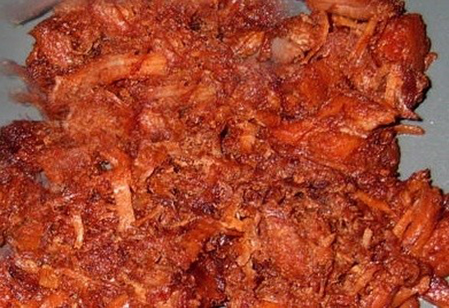 Ya lista la carne la vamos a freír en un sartén con unas dos cucharadas de manteca de puerco, si hace falta grasa agregar más manteca, una vez que la carne esté bien frita vamos a agregar lo que licuamos y seguimos friendo durante unos 5 minutos más a fuego lento.