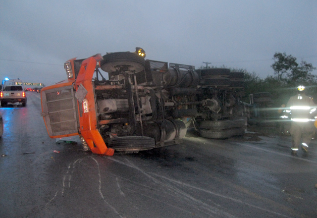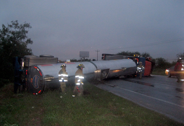 3/12/2015 - De una muerte segura se salvó el chofer de un tráiler pipa cargado con 25 mil 300 litros de base para la fabricación de jabón, mas no así de las fracturas y múltiples lesiones que le resultaron al volcarse el tráiler pipa que tripulaba en el kilómetro 8.5 de la carretera a Reynosa, tras de colisionar con un autobús propiedad de una universidad, el cual se retiró al plantel educativo.