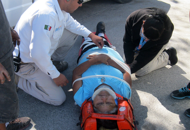 Solicitaron apoyo a sus colegas de Coramedic, quienes arribaron en una ambulancia para subir a la señora lesionada y trasladarla al Instituto Mexicano del Seguro Social.