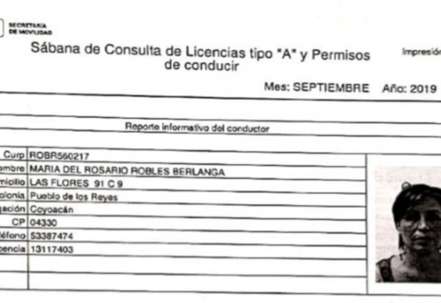 La Secretaría de Movilidad de la Ciudad de México respondió mediante oficio firmado por Margarito Rojas Salas, Director General de Registro Público de Transporte, que la licencia de conducir tipo “A” con folio 13117403 a nombre de María del Rosario Robles Berlanga con domicilio en Los Reyes, Coyoacán es auténtica.