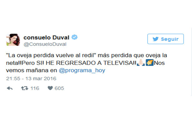 Antes de aparecer en el programa matutino "Hoy", Consuelo compartió en Twitter que volvería a la empresa para la que trabajó por 25 años antes de salir de ahí. "La oveja perdida vuelve al redil. ¡Más perdida que oveja, la neta! ¡Pero SÍ! ¡HE REGRESADO A TELEVISA!", escribió en la cuenta @ConsueloDuval.