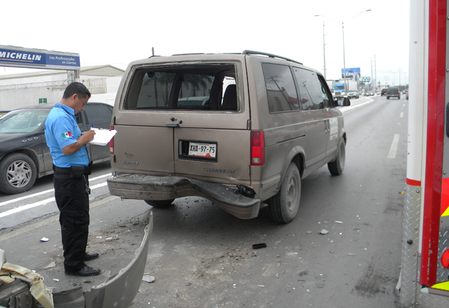 Reyes Rangel Montelongo, de 47 años, domiciliado en la calle Loma Mía número 93, del fraccionamiento Infonavit Lomas de San Juan, le manifestó a un perito de la Policía Vial, que en la camioneta marca Chevrolet Astro, modelo 1998, color café, iba de norte a sur por la avenida Pedro Cárdenas Gutiérrez, cuando fue chocado en la parte posterior, por la camioneta marca Mazda, modelo 2001, color arena, de Oscar Rodríguez.