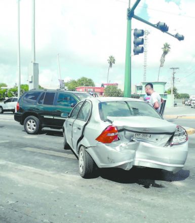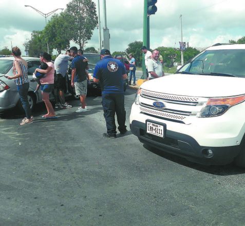 Una dama y dos menores de edad resultaron golpeados en un fuerte choque carambola, de tres vehículos, con saldo de miles de pesos en daños materiales, sobre el cruce del boulevard Manuel Cavazos Lerma y la avenida Calixto de Ayala.