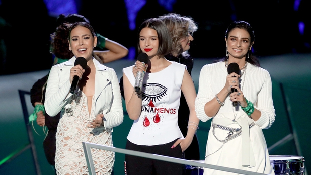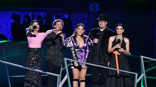 3.- Por tercera ocasión, Danna Paola salió al escenario, esta vez en compañía de Aislinn Derbez y dejó con la boca abierta a más de uno por su rockero y atrevido vestido de red en color blanco, que acompaño de una chamarra biker del mismo tono.