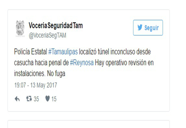Mediante un segundo tuit, la Vocería detalló: "Anoche se detectó movimiento inusual de remoción de tierra en inmediaciones penal #Reynosa. Con tecnología se localizó el túnel inconcluso".