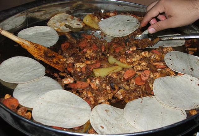 La manera de servir es en tacos con tortillas de harina o maiz acompañados de salsa roja y guacamole.