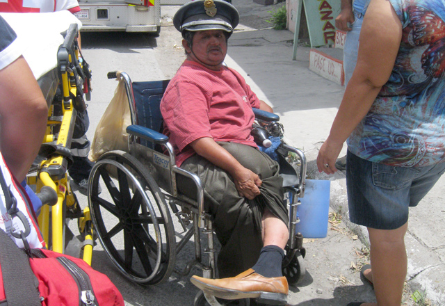 15/06/2016 - Un minusválido que pide dinero a los automovilistas, en la calle Primera entre Canales y Mina, resultó lesionado en ese sector de la ciudad al involucrarse en un percance de vialidad al momento de desplazarse en su silla de ruedas.