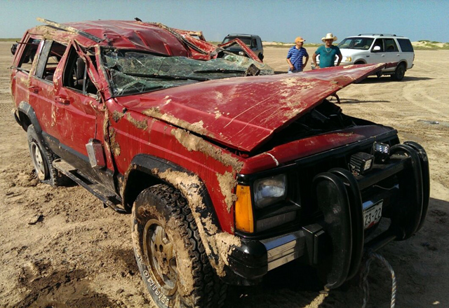 Técnicos en urgencias médicas de Protección Civil, de guardia en la playa, al ser enterados del accidente, se trasladaron de la entrada al balneario, hasta el sitio del accidente, confirmando la volcadura de un vehículo todo terreno, marca Jeep Cherokee, color rojo.