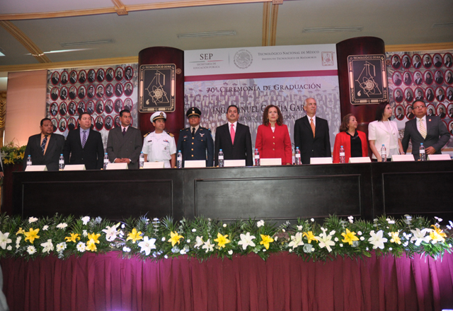 El acto protocolario inició con los honores correspondientes a nuestro Lábaro Patrio y al Escudo de Armas de Tamaulipas. Posteriormente se hizo la presentación de las personalidades que conformaron el presidium: Lic. y Profr. José Luis Cuéllar Ornelas, (+) representante del gobernador del Estado, Ing. Egidio Torre Cantú; subdirector académico, Ing. Paulino Robledo Figueroa; subdirector de servicios administrativos, Lic. Juan Pablo Tristán Moreno; subdirector de planeación y vinculación, Mtro. Gregorio Álvarez de la Fuente; secretaria de la delegación D-V-108, Lic. Bertha Laura Pérez Rodríguez; secretaria de seguridad social de la región III, Sección 61, Ing. Gladys Benavides Medrano; padrino de la 70ª. Generación, Ing. Manuel García Garza, así como demás directivos y representantes de escuelas preparatorias, también estuvo presente la Secretaría de Marina y de las Fuerzas Armadas y presidiendo la mesa de honor la Lic. Ana Isabel Lerma González, directora del ITM, quien hizo uso de la palabra para dirigir un mensaje a los presentes y muy en especial a los alumnos graduados, expresando la importancia de esta ceremonia en que un gran porcentaje de los graduados ya están titulados, lo cual es un orgullo, parteaguas que marcará estas ceremonias, asimismo hizo un llamado a los demás graduados de no separarse de la institución, que hagan su protocolo y se titulen.