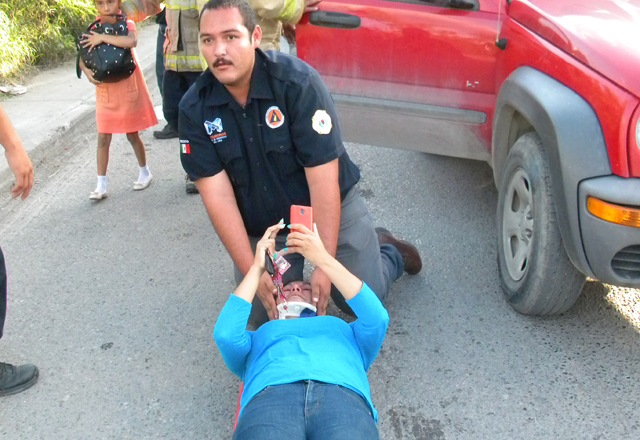10/11/2015 - Cinco mujeres, tres adultas y dos inocentes menor de edad, entre ellas una bebé de brazos, y daños materiales por miles de pesos, fue el saldo del fuerte choque carambola de un automóvil con dos camionetas todo terreno, en las avenidas 12 de Marzo y Los Palmares, ocasionado por imprudente dama, quien estuvo a punto de perder la vida al salirse del camino con el auto y caer en unos matorrales.