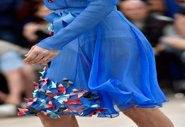 Con los labios teñidos de rojo, al mismo tono que sus zapatos, Nailea lució un vestido traslúcido azul hasta las rodillas y las muñecas, adornado con moños de diversos colores, que no dejó espacio para la duda sobre lo que llevaba debajo.