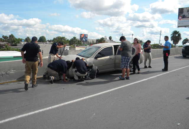 Al llegar al lugar constataron que fue el choque de un automóvil marca Chevrolet Cobalt, modelo 2005, de cuatro puertas, color dorado, contra los muros de contención, central y del lado derecho, así como con la base de concreto de un poste de fierro de alumbrado público, el cual quedó derribado con las dos luminarias, y atravesado, impidiendo la circulación automovilística en el carril de norte a sur, para continuar al poniente del boulevard Manuel Cavazos Lerma.