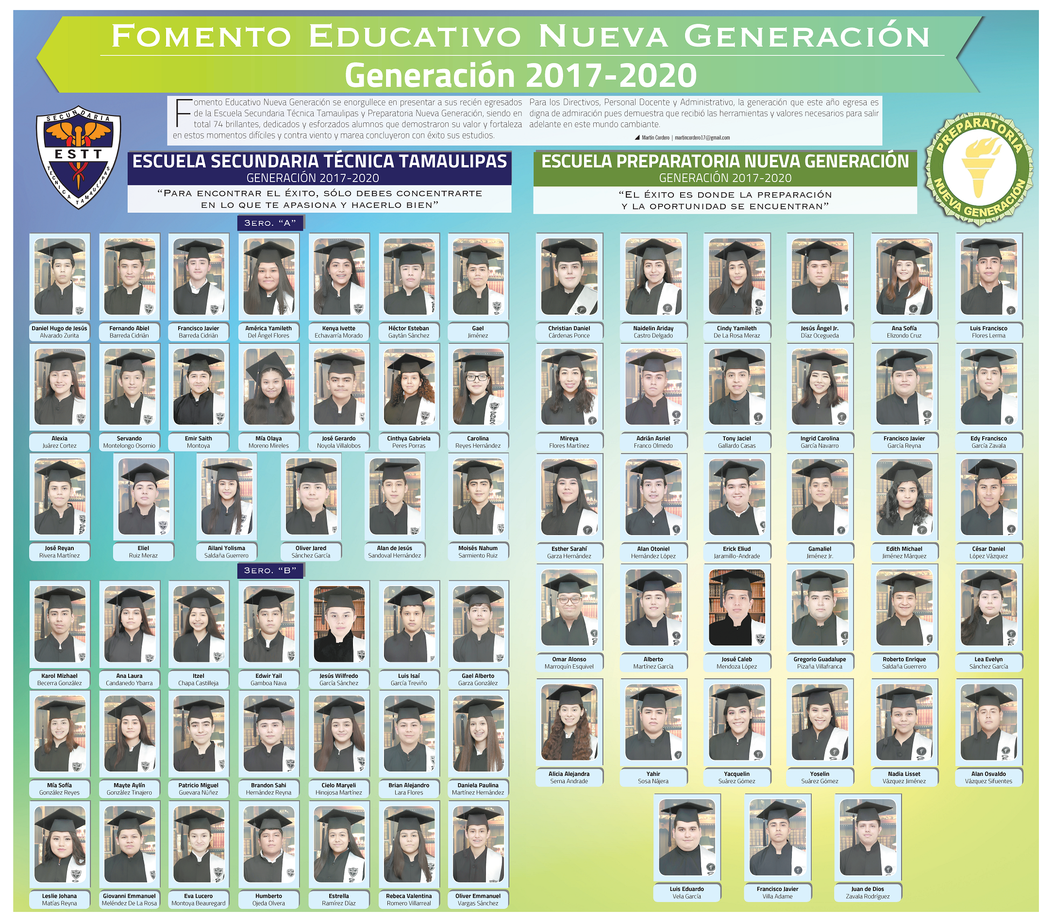 Fomento Educativo Nueva Generación se enorgullece en presentar a sus recién egresados de la Escuela Secundaria Técnica Tamaulipas y Preparatoria Nueva Generación, siendo en total 74 brillantes, dedicados y esforzados alumnos que demostraron su valor y fortaleza en estos momentos difíciles y contra viento y marea concluyeron con éxito sus estudios.
