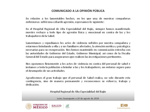 Por su parte, el Hospital Regional de Alta Especialidad del Bajío lamentó los actos de violencia que sufrió la enfermera, a quien brindarán atención médica y psicológica.