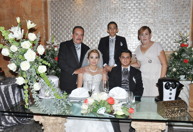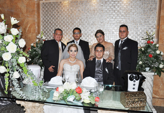 Su banquete de bodas estuvo de ensueño, con abundantes velas, arreglos florales y bases de cristal, que le dieron un toque muy romántico y único a su fiesta, la cual culminó hasta el día siguiente con la tornaboda, la que se celebró en la residencia de una de las familias, en donde tocó la Banda Perla Tamaulipeca, y en la recepción disfrutaron de la Banda Tequilera y del grupo Sabor a Coco.