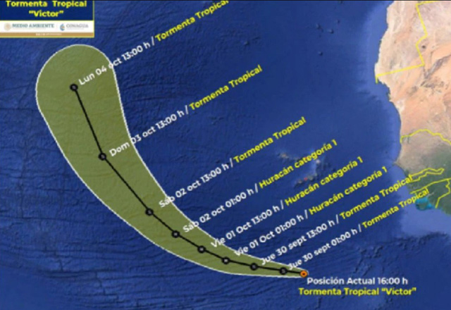 De acuerdo al organismo climático, la tormenta tropical registra vientos máximos sostenidos de 65 kilómetros por hora, con rachas más fuertes que rozan los 85 kilómetros hora. Se espera que en la madrugada del viernes 1 de octubre el sistema evolucione a huracán de categoría 1 en la escala Saffir-Simpson, sin afectaciones en tierra. Unas 24 horas más tarde comenzará a debilitarse.