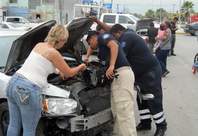 Los técnicos en urgencias médicas de Protección Civil se dirigieron a un automóvil marca Chevrolet Malibu, modelo 2008, color gris, de cuatro puertas, para darle los primeros auxilios, a la conductora Laura Esthela Villafranca Rincón y a la inocente menor de edad.