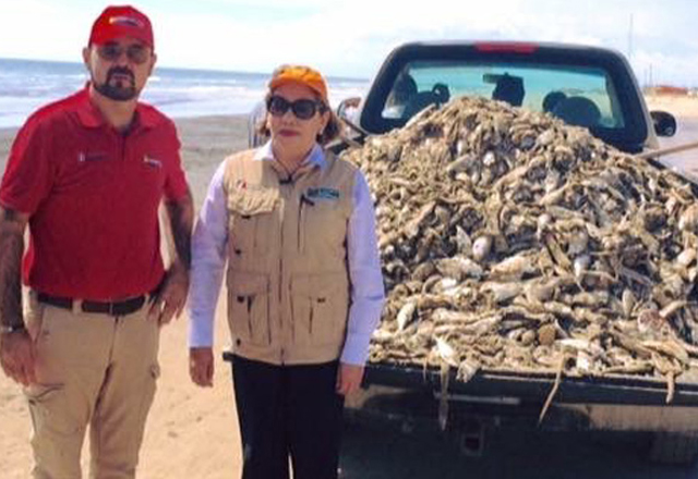 22/09/2016 - Matamoros, Tamaulipas.-, Tras confirmarse el efecto aerosol de leve a moderado y el incremento en la mortandad de peces a consecuencia del fenómeno natural “Marea roja” en la playa de Matamoros, el gobierno de Egidio Torre Cantú dispuso el despliegue de un operativo de vigilancia sanitaria, brigadas médicas de forma preventiva, así como el retiro inmediato de casi dos toneladas y media a “rellenos” cavados exprofeso de peces muertos para evitar posibles focos de infección.