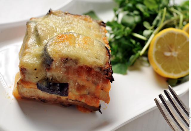 Para formar el pastel untar con mantequilla un molde, colocar una capa de rebanadas de berenjena una más de puré con queso y seguida de otra de berenjena así hasta terminar los ingredientes.