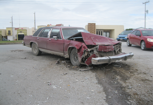 3/02/15.- Un automóvil Grand Marquis propiedad de un texano quedó chato de la parte frontal tras estrellarse con el costado medio derecho de un microbús que se le atravesó en el cruce de las avenidas Marte R. Gómez y Dr. Carlos Canseco González, a la entrada del fraccionamiento Misiones.