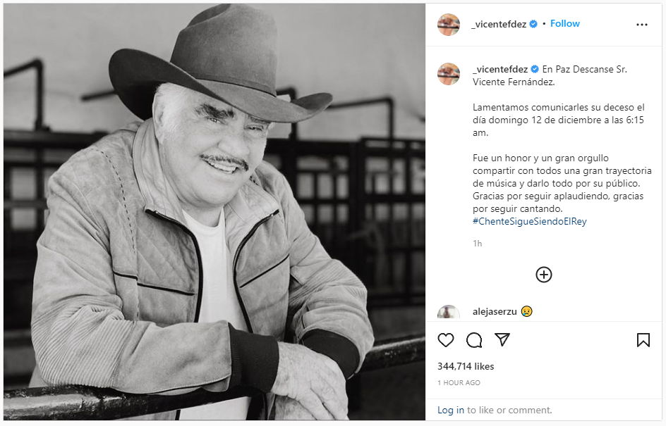 A través de sus redes sociales, la familia de Vicente Fernández comunicó el fallecmiento del ídolo el día domingo 12 de diciembre a las 6:15 am.