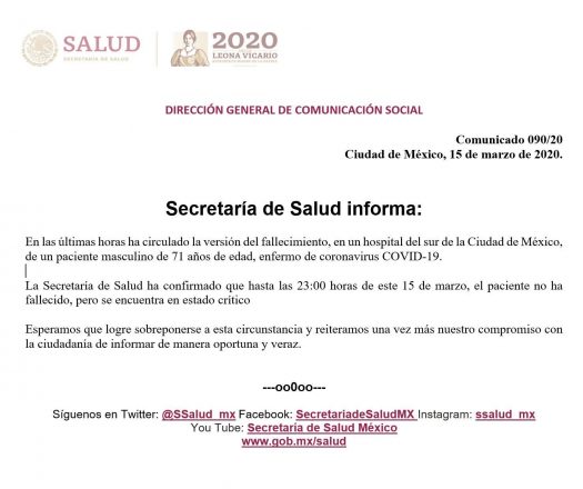 “La Secretaría de Salud ha confirmado que hasta las 23:00 horas de este 15 de marzo, el paciente no ha fallecido, pero se encuentra en estado crítico”, dice la dependencia federal.