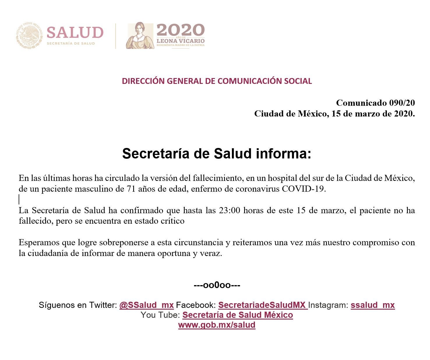 “La Secretaría de Salud ha confirmado que hasta las 23:00 horas de este 15 de marzo, el paciente no ha fallecido, pero se encuentra en estado crítico”, dice la dependencia federal.