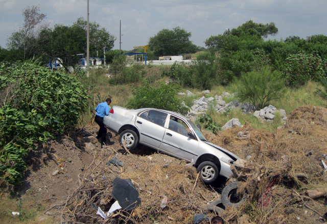 20/08/2015 - Un joven matrimonio y su hijo de brazos, estuvieron a punto de perder la vida, en horas de la mañana de ayer, al volcarse el carro en el que viajaban, y caer sobre unos montones de tierra y basura, en un predio de la avenida División del Norte, a espaldas del Parque Ciudad Industrial, y a un costado de un cárcamo de la Junta de Aguas y Drenaje de Matamoros.